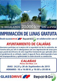 Desde la Concejalía de Urbanismo, se lanza una campaña de seguridad vial junto con la Policía Local. La próxima actuación es haber contactado con una empresa que de manera gratuita ofrece imprimación de lunas. Es un repelente de agua que ayuda a mejorar la visión ante las lluvias torrenciales. Los días 24, 25 y 26 de SEPTIEMBRE, en horario de 10-14 y de 16-20 podrán pasar por el stand que se instalará en El Real para que todos los calañeses puedan probar esta propuesta. No escatimemos en seguridad vial ni en educación víal.