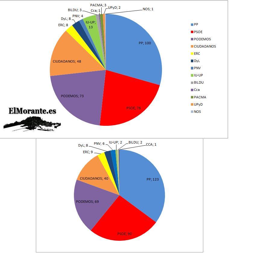 Igualmente entre los partidos mayoritarios el reparto sería diferente, los más perjudicados con el sistema actual son PODEMOS, que pasaría de 69 a 73, Ciudadanos de 40 a 48 e IU-PA de 2 a 13 (pasaría de ser 8 fuerza en escaños a 5). Los más beneficiados serían PP que pasaría de 123 a 100 y PSOE que perdería 14 pasando de 90 a 76.