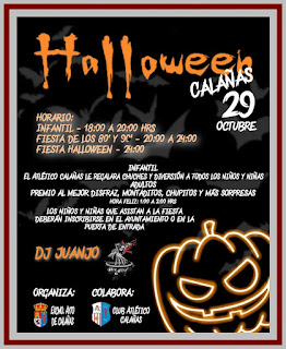Hoy sábado 29 de octubre, en el Salón Multifuncional de Calañas, se celebrará la "Fiesta Halloween", que comenzará a partir de las 18:00 horas con actividades para los más pequeños. A partir de las 20:00 tendrá lugar la música de baile de los años 80 y 90, y desde las 24:00 horas será el turno de la música actual a cargo de Dj JuanJO. Se premiará al mejor disfraz y habrá servicio de montaditos, hora feliz y varias sorpresas.